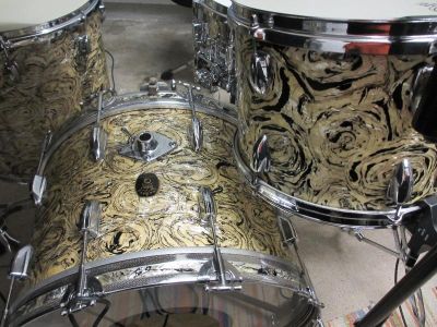 "Star Drums" (Vorläufer von TAMA) von 1965 im restaurierten Originalfinish. Die Snare ist eine alte Premier 2000 Stahlsnare mit Gußspannreifen und Parallelabhebung (auch aus den swinging Sixties).